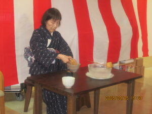 看護師さん、今年もお茶を立てて下さいました。今年も暑い日が続いているので、冷たいお抹茶です。蓮の葉?ちょっと何の葉か忘れましたが(笑)→お作法が苦手でごめんなさい(笑)葉っぱにお水を垂らして、涼しさを演出するそうですよ!