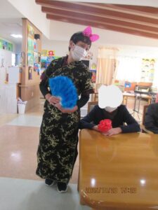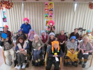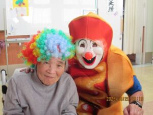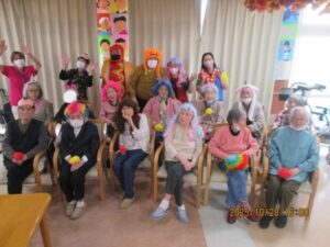 ヘンテコな職員と一緒に記念写真。ご協力ありがとうございます。利用者様、今年も被らされ・・・???の表情ですね(笑)